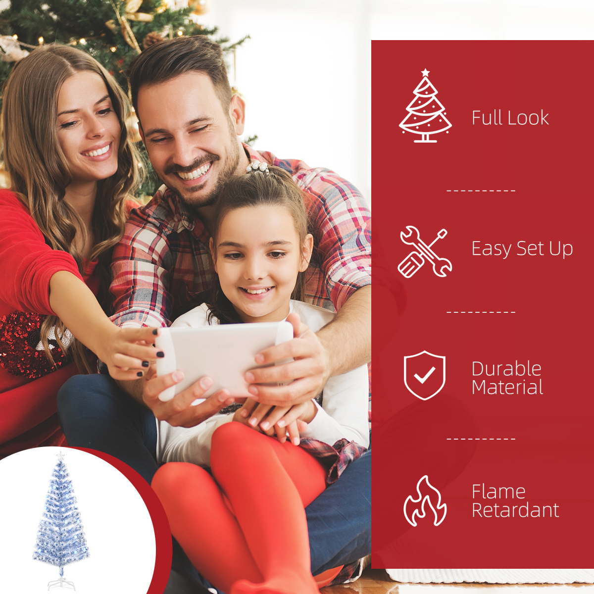 BEAUTIFUL ARTIFICIAL DESIGN: Covered in a white and blue plastic branch design, it looks beautiful and is safe for use in every kind of home. Stored correctly, it will last for years.LED LIGHTS: This Christmas tree with one flashing mode gives you greater choice in creating the perfect atmosphere.METAL BASE: Keeps the tree stable, sturdy and upright throughout the season.EASY TO ASSEMBLE & DISASSEMBLE: Hinged and folding branches for easy storage as well as preventing damage once stored. Ideal for homes short on storage space.STAR TOPPER BRANCH: Sturdy and long enough to place your angel or star for the finishing touch.