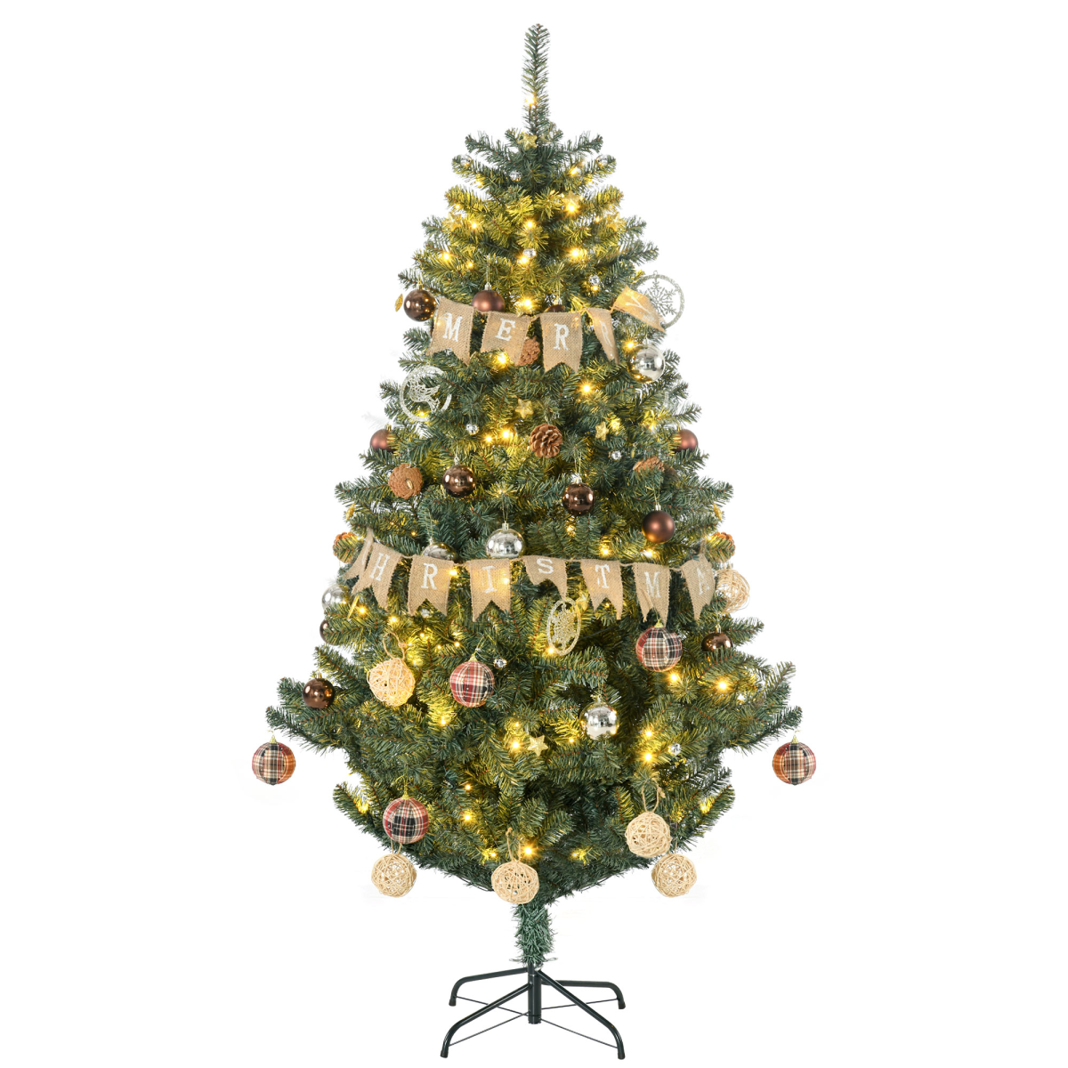 Your christmas tree set up - ready quickly from out the box. This HOMCOM 5ft artificial piece comes with lights, baubles, decorations and a 'Merry Christmas' banner - a sparkling design, with room to add on own decorations if you want. Made from tough plastic, this is an artificial design: strong and sturdy and suitable for yearly use. Formed of three separate pieces to easily fit together. Also comes with a steel base, so it stands steady.