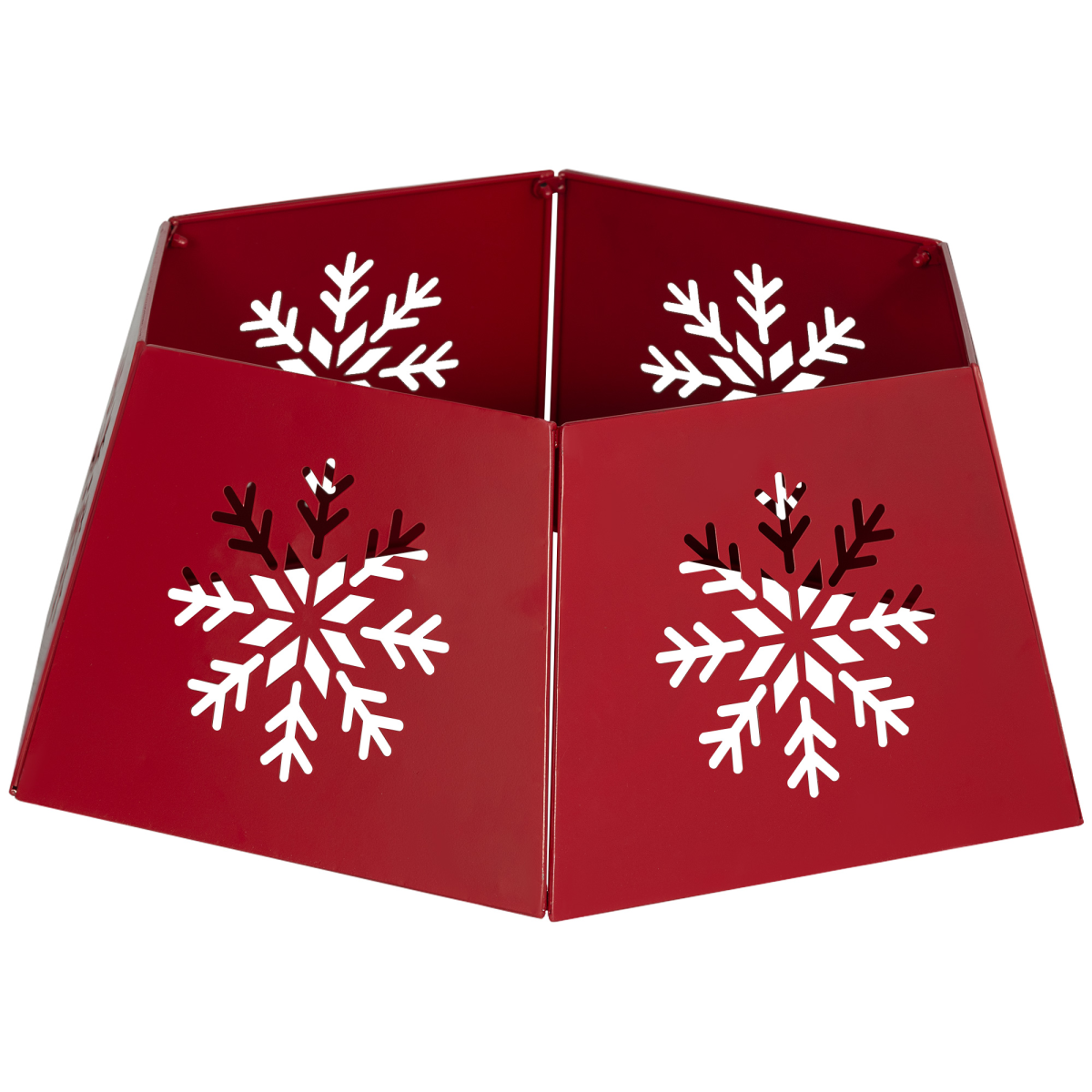● Red finish and hollow snowflake pattern enhance festive decor