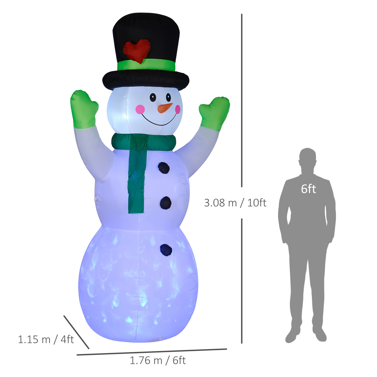 - Type: Inflatable Christmas Cheerful Snowman Wearing Black Hat, Green Scarf and Gloves