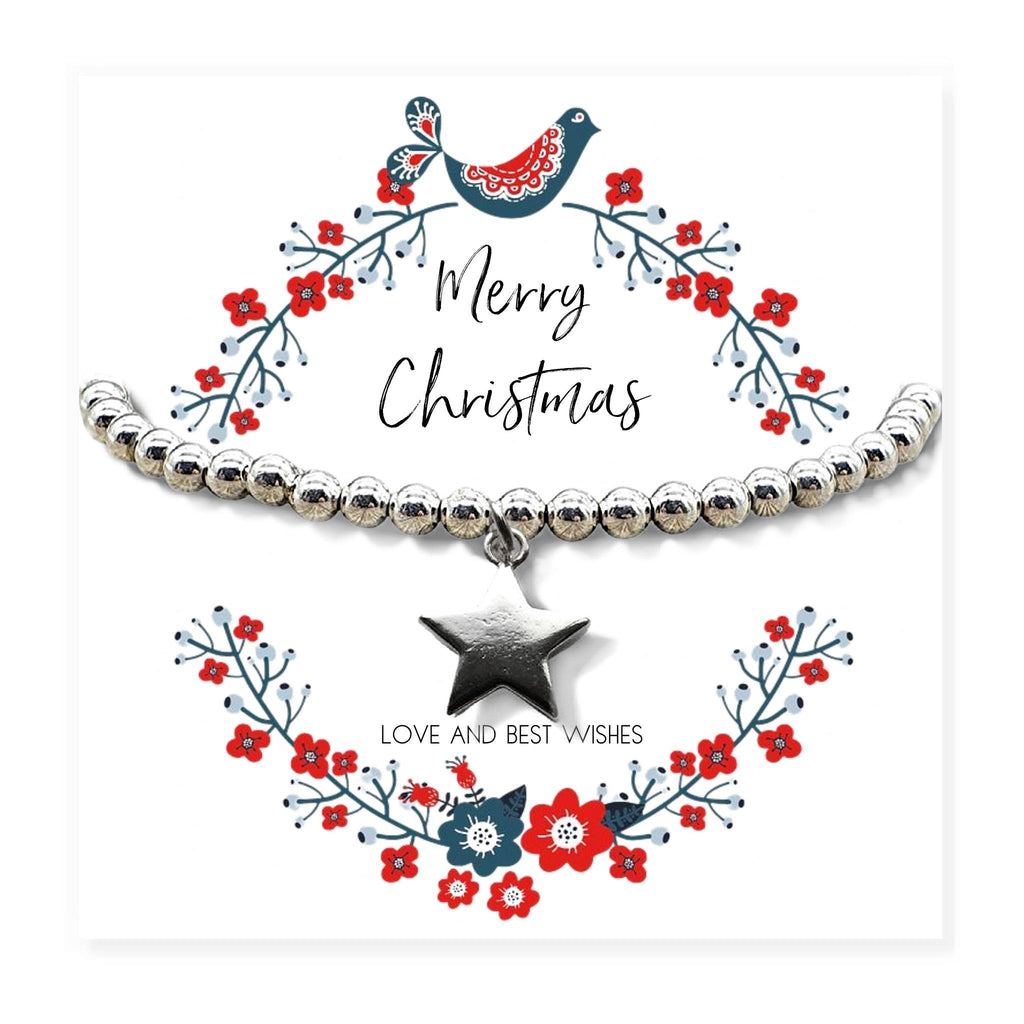 Are you looking for a great Christmas gift? Well we have this lovely silver star beaded bracelet that come on a message card with the words "Merry Christmas. Love and best wishes". It is sent in a lovely black gift box making this a great Christmas gift for your mum, best friend, auntie, neighbour, secret Santa, sister and are a great idea for teachers too. The card has a small space for you write a little note or can be left blank.