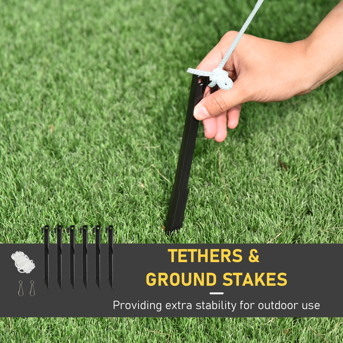 Includes 6 x ground stakes, 2 x guy ropes and 2 x sandbags